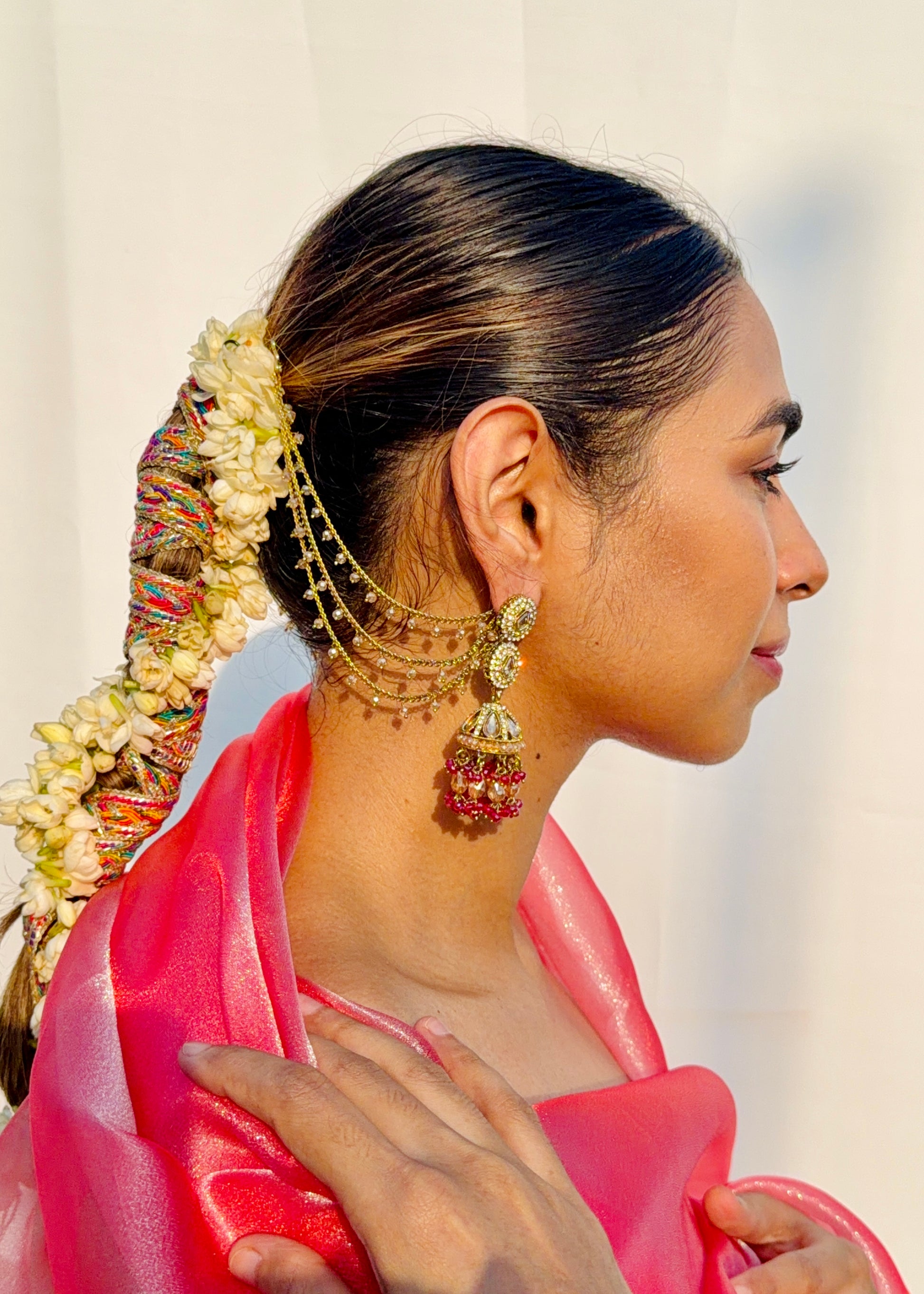 Dhairyaa Polki Pearl Jhumkas with Earchain (Red)